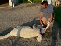 Chenoa was tranquilized and laid on her side. The vet determines which direction the uterus is twisted, so as to know which way to roll the body of the alpaca. He ties a rope to her back legs, has me firmly hold downward on the belly of the alpaca, and he rolls her over (picture legs straight up in the air as she goes over :). He checks again, and determines we've rolled her the wrong way. So, following the same procedure, we roll her back (back to square one). Then we slowly, roll her the other direction. Ahhh, success.